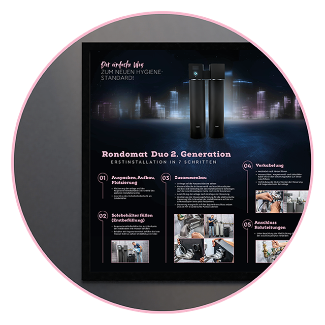 Order the poster for the installation of the Rondomat Duo system from us at +49 6203 73 73 or sl@bwt.de.